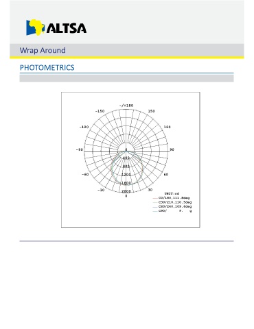 Wrap Around PHOTOMETRICS -/+180 -150 150 -120 120 -90 0 90 400 800 -60 1200 60 1600 -30 2000 30 0 UNIT:cd C0/180,111.8deg C30/210,110.5deg C60/240,109.6deg C90/ 9. g