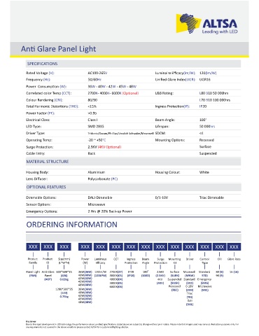 Product Product Size(mm) Power Luminous CCT Ingress Beam Surge Moun ng Driver Control CRI Glare Rate