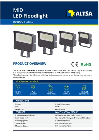 The ALTSA MID LED Floodlight provides extreme lumen output performance and long las ng stability.