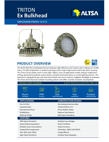 The ALTSA TRITON Ex Bulkhead luminaire features high efficiency LED chipsets with a lifespan of 50 000