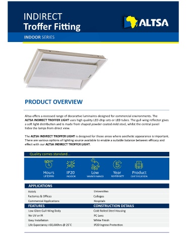 ALTSA INDIRECT TROFFER LIGHT uses high quality LED chip sets or LED tubes. The gull-wing reflector gives