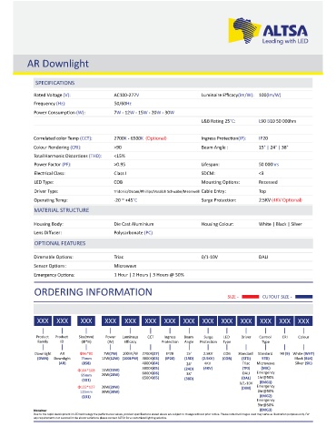 Product Product Size(mm) Power Luminous CCT Ingress Beam Surge LED Driver Control CRI Colour