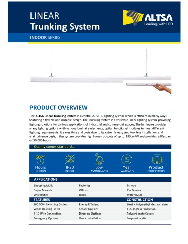The ALTSA Linear Trunking System is a con nuous LED ligh ng system which is efficient in many ways