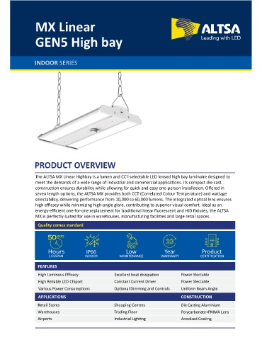 The ALTSA MX Linear Highbay is a lumen and CCT-selectable LED lensed high bay luminaire designed to