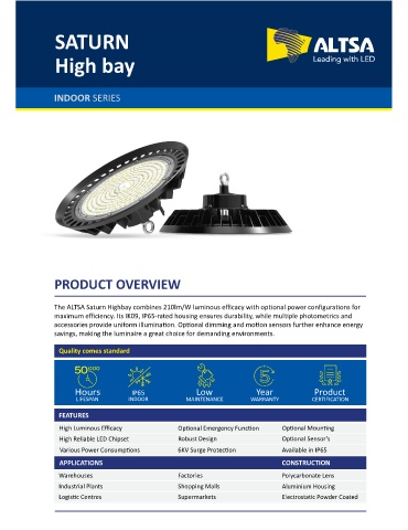 The ALTSA Saturn Highbay combines 210lm/W luminous efficacy with op onal power configura ons for