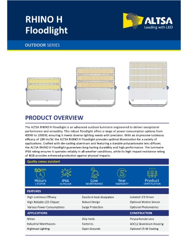 efficacy of 180 lm/W, the ALTSA RHINO H Floodlight provides op mal illumina on for a variety of