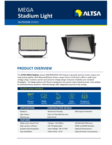 The ALTSA MEGA Stadium u lizes SMD3030/5050 LED Chipset to provide extreme lumen output and