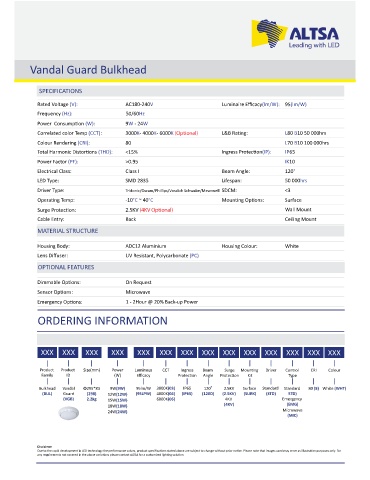 Bulkhead Vandal Φ295*83 9W(9W) 95lm/W 3000K(03) IP65 120° 2.5KV Surface Standard Standard 80 (8) White (WHT)