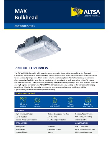 The ALTSA MAX Bulkhead is a high-performance luminaire designed for durability and efficiency in