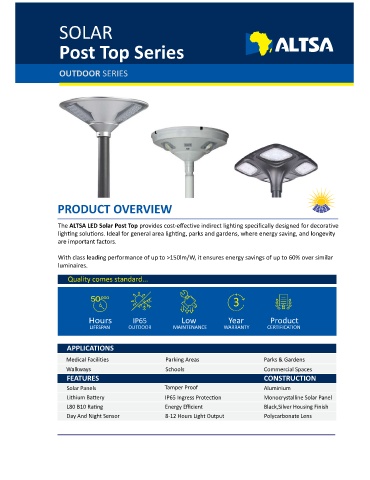 The ALTSA LED Solar Post Top provides cost-effec ve indirect ligh ng specifically designed for decora ve