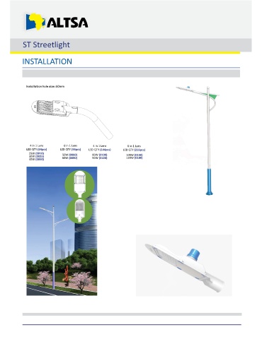 ST Streetlight INSTALLATION 4 in 1 Lens 6 in 1 Lens 4 in 1 Lens 6 in 1 Lens LED QTY (64pcs) LED QTY (96pcs) LED QTY (144pcs) LED QTY (216pcs) 25W (0010) 50W (0060) 80W (0100) 100W (0150) 30W (0025) 60W (0080) 90W (0120) 120W (0180) 40W (0050)